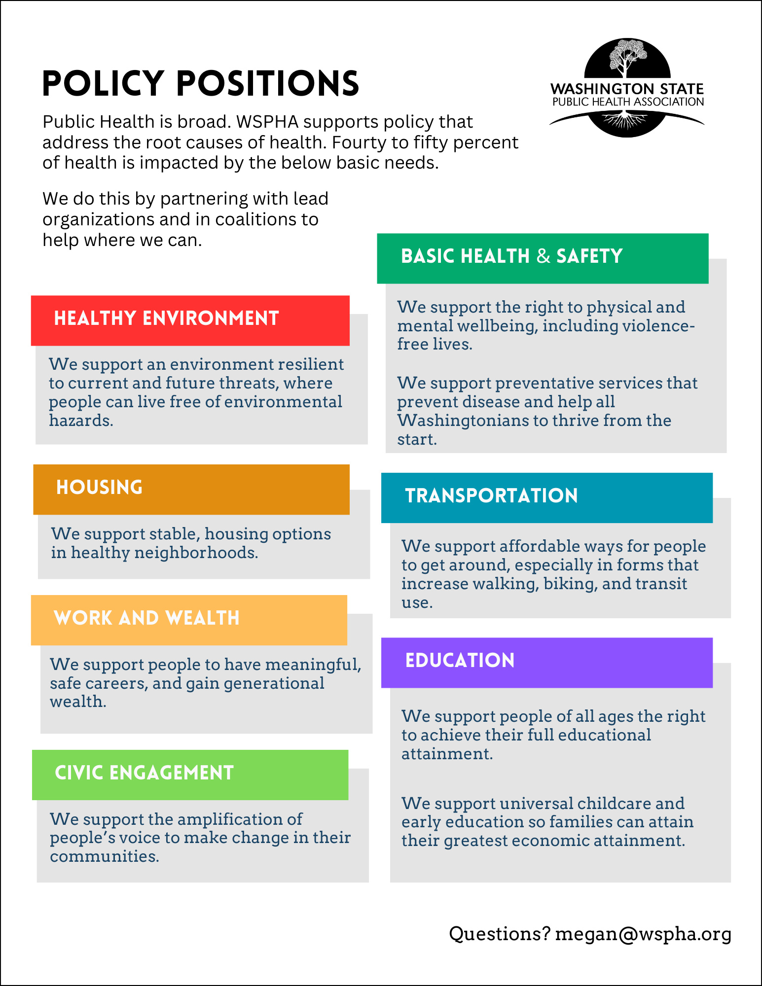 Along with our partners in the Public Health Roundtable, WSPHA champions programs and resources that support the public’s health. We promote science-based solutions to health issues and advocate for adequate resources to guarantee the stability of our public health system. Policy priorities include funding for foundational public health services and eliminating health inequities.